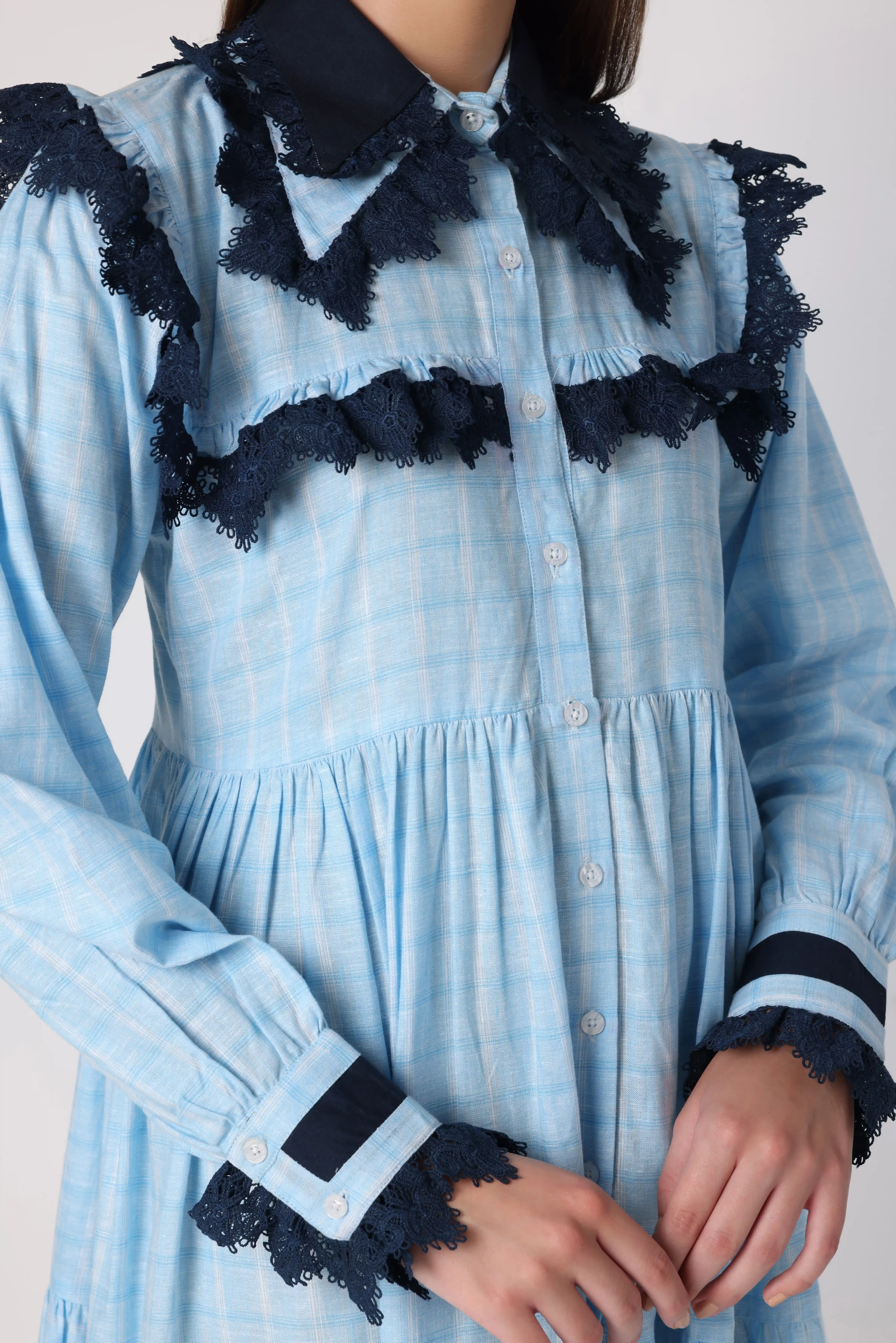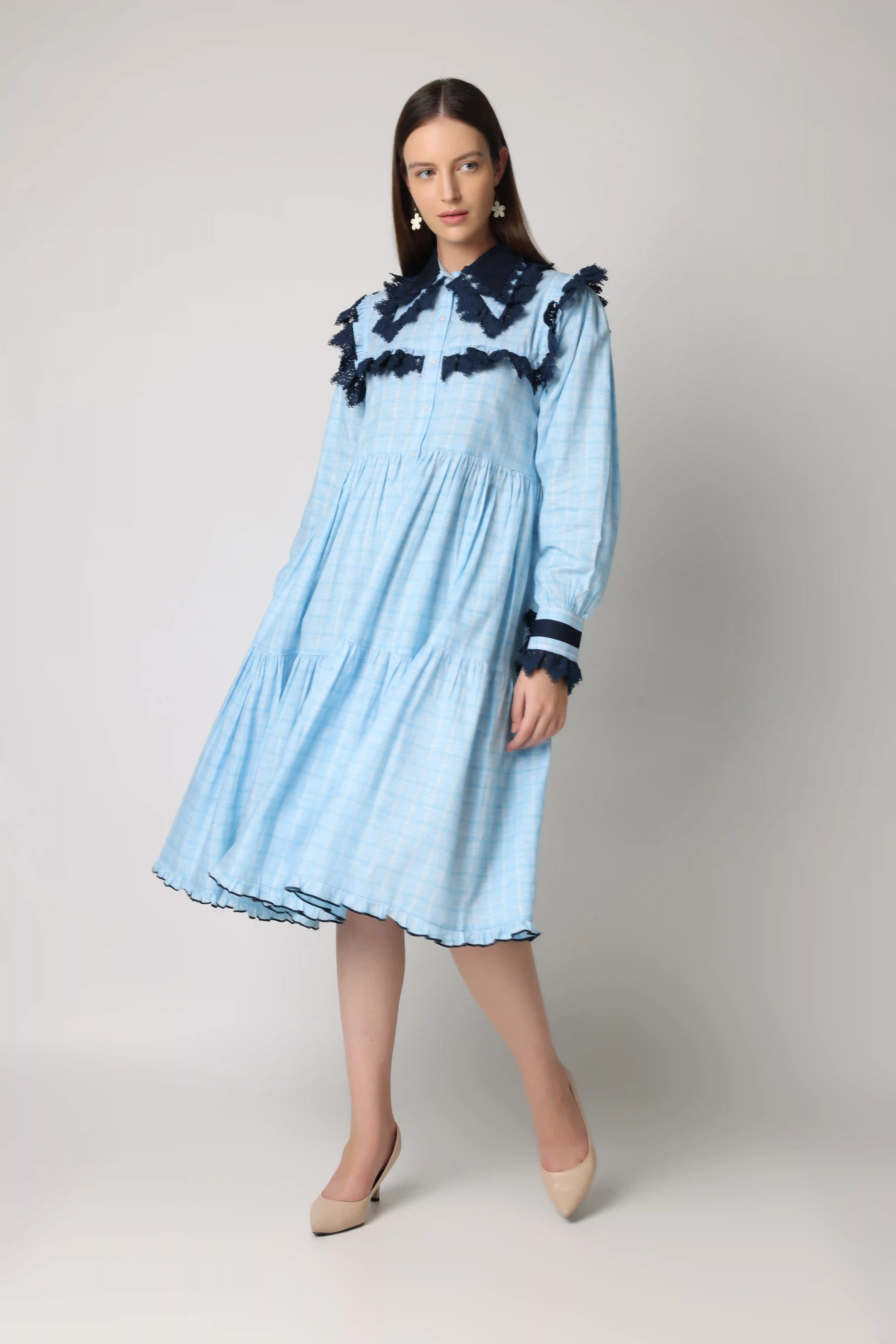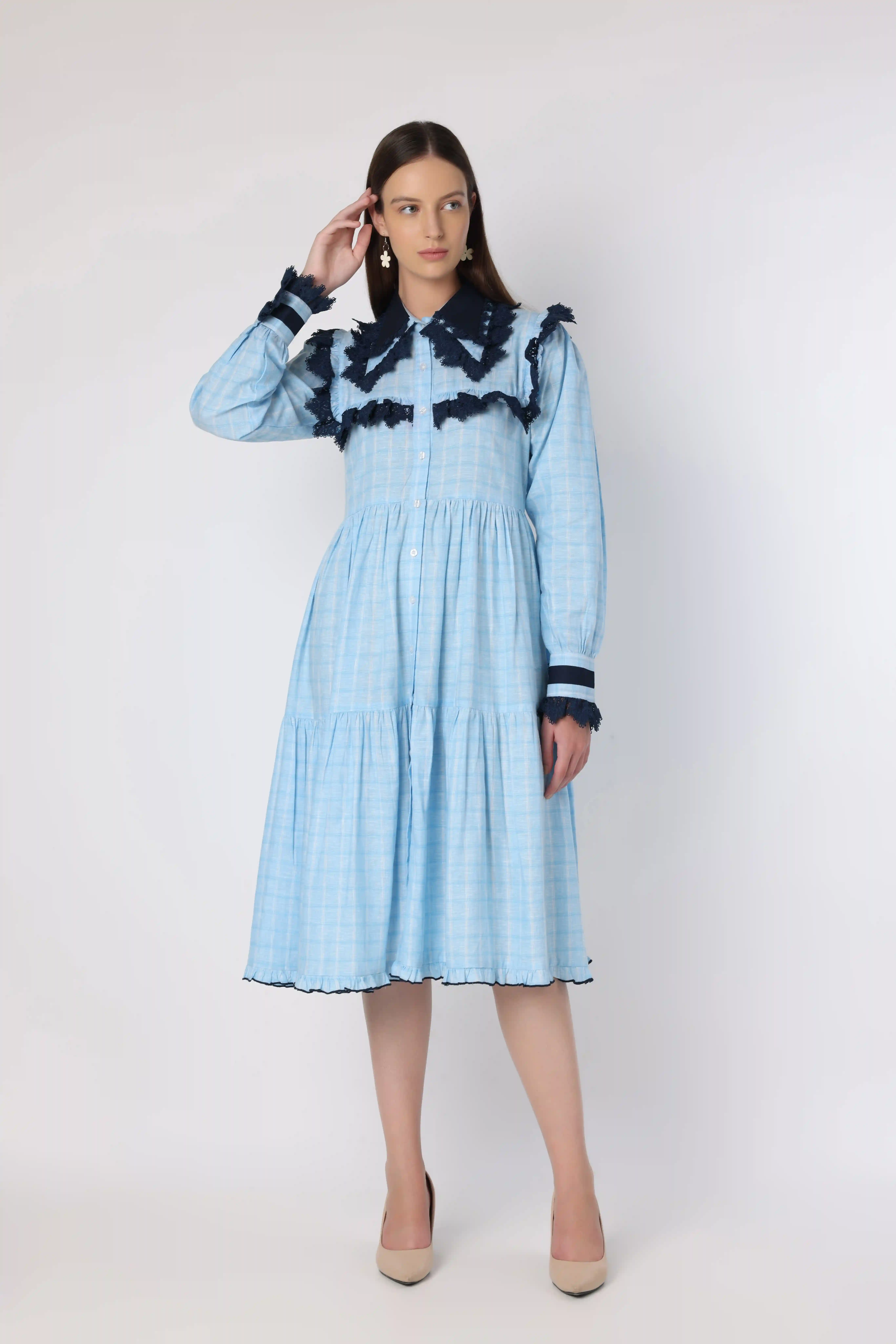 “Chic calf -length dress in light blue and white check print, featuring lace detailing and a stylish double collar for a fresh, sophisticated look."